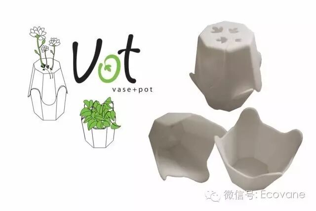 VOT是一个花瓶和花盆的功能组合体。通过改变造型,它将能够放置一束直立鲜花或容纳一盆花。当VOT上端的开口向下翻用于放盆栽的时候,用于放花束的口就会巧妙地变成盆栽的排水渠道。VOT的可生物降解性使得它可以与任一堆肥物质一起丢弃或直接埋在花园里。
