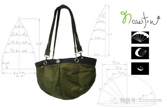 牛顿手袋是废旧降落伞和家居布艺的第二次生命。降落伞的材料在功能上已经过时了,而家居布艺在时尚方面已经过时。两者的结合一方面恢复了家居布艺的时尚价值,另一方面也赋予了降落伞新的功能。这两种材料仍然保留他们以前的产品周期特征;家居布艺继续为家提供舒适,并且手袋的设计直接源自于降落伞材料的预期功能。